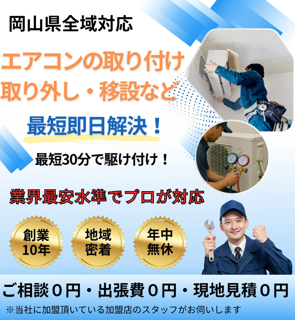 岡山県全域どこでも対応!エアコン取り付け・取り外し・移設のプロが最短即日対応!