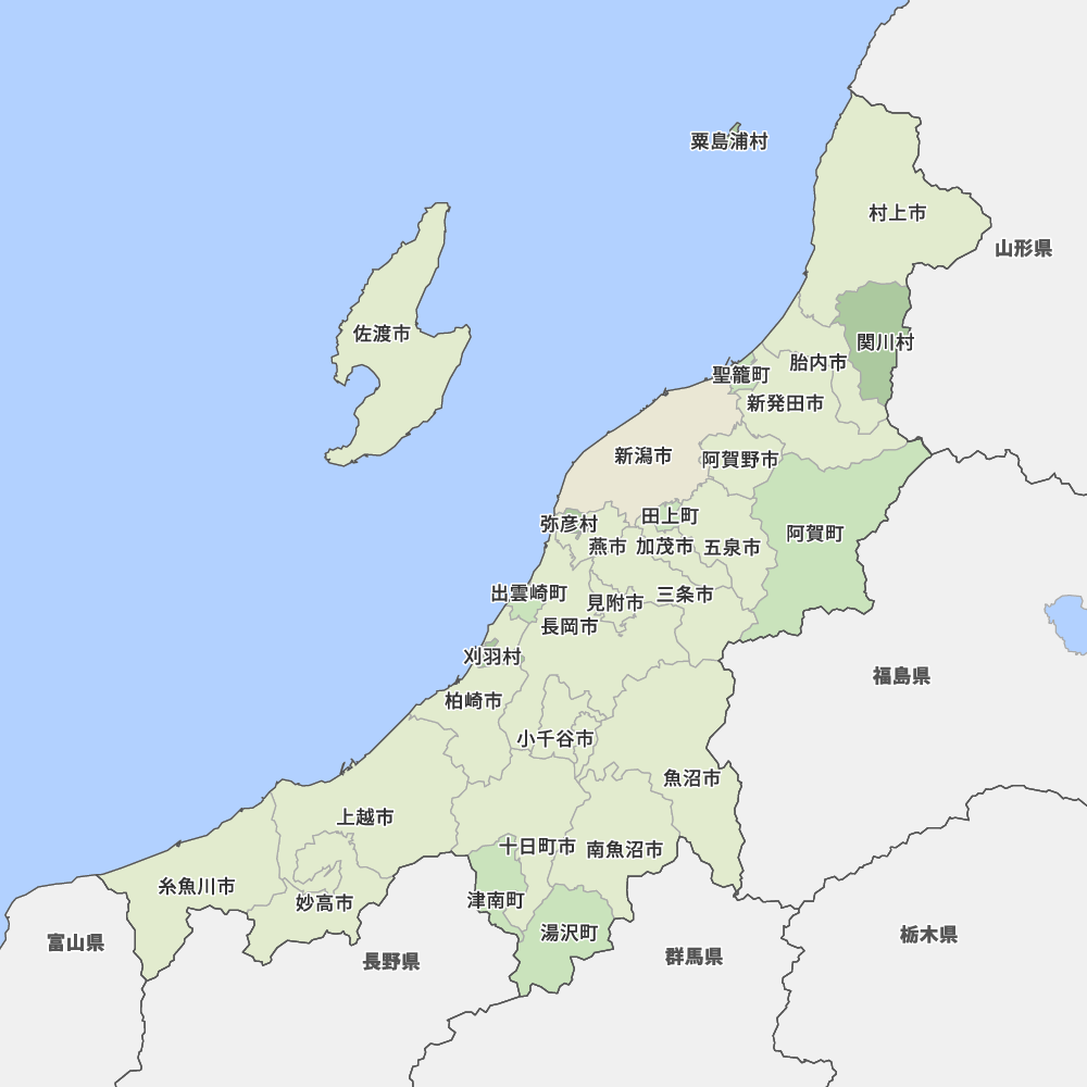 新潟市|長岡市|三条市|柏崎市|新発田市|小千谷市|加茂市|十日町市|見附市|村上市|燕市|糸魚川市|妙高市|五泉市|上越市|阿賀野市|魚沼市|南魚沼市|胎内市|聖籠町|弥彦村|田上町|阿賀町|出雲崎町|湯沢町|津南町|刈羽村|関川村