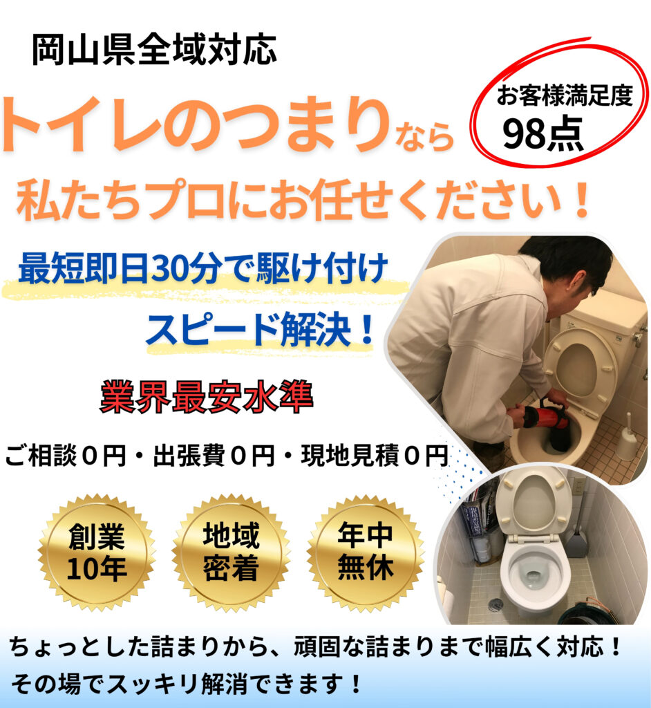 【岡山県全域】最短即日30分でトイレの詰まりの修理を実施中!